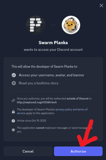 - You will be redirected to Discords site, where you will have to authorize planka to use your discord account.